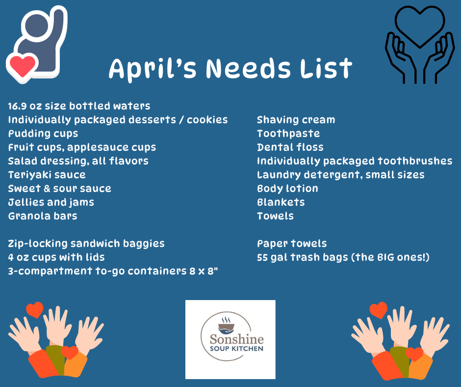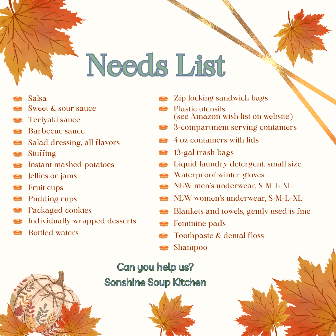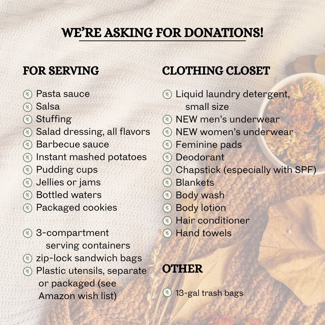 Please call the office if you are planning a food drive, we are not a food pantry, we are a soup kitchen that prepares 60 to 90 meals a night, therefore we have specific needs.