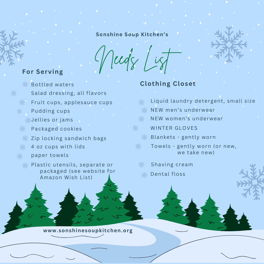 Please call the office if you are planning a food drive, we are not a food pantry, we are a soup kitchen that prepares 60 to 90 meals a night, therefore we have specific needs.